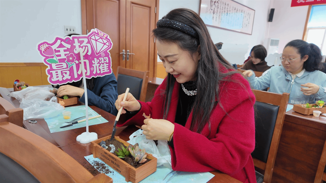 讲座结束后,微景观多肉木盒盆栽DIY活动于三楼南会议室开展。在专业老师的指导下,女职工们纷纷化身“生活美学家”,全神贯注地投入创作。现场气氛热烈而温馨,在感受美、欣赏美、创造美的过程中,不仅舒缓了工作压力,提升了艺术修养,更增进了职工之间的凝聚力。