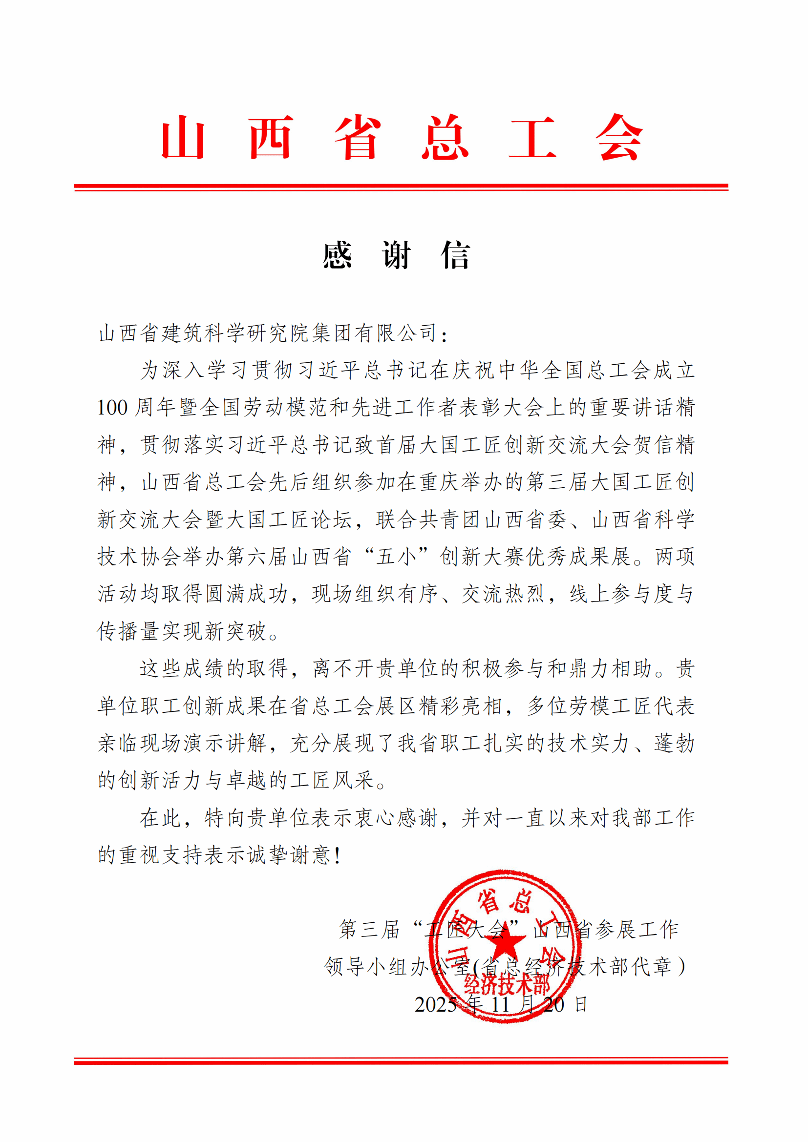近日,山西省总工会向山西省建筑科学研究院集团有限公司发出感谢信,感谢其为活动的成功举办付出的努力。