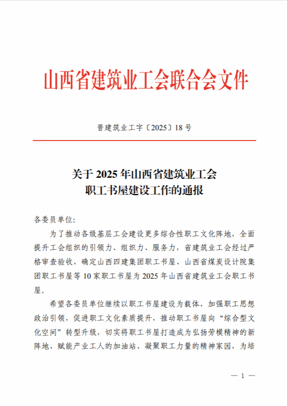 近日,山西省建筑业工会联合会发布2025年建筑业工会职工书屋评选结果,山西省建科院集团公司职工书屋成功获评,充分彰显了集团公司职工文化阵地建设的扎实成效。