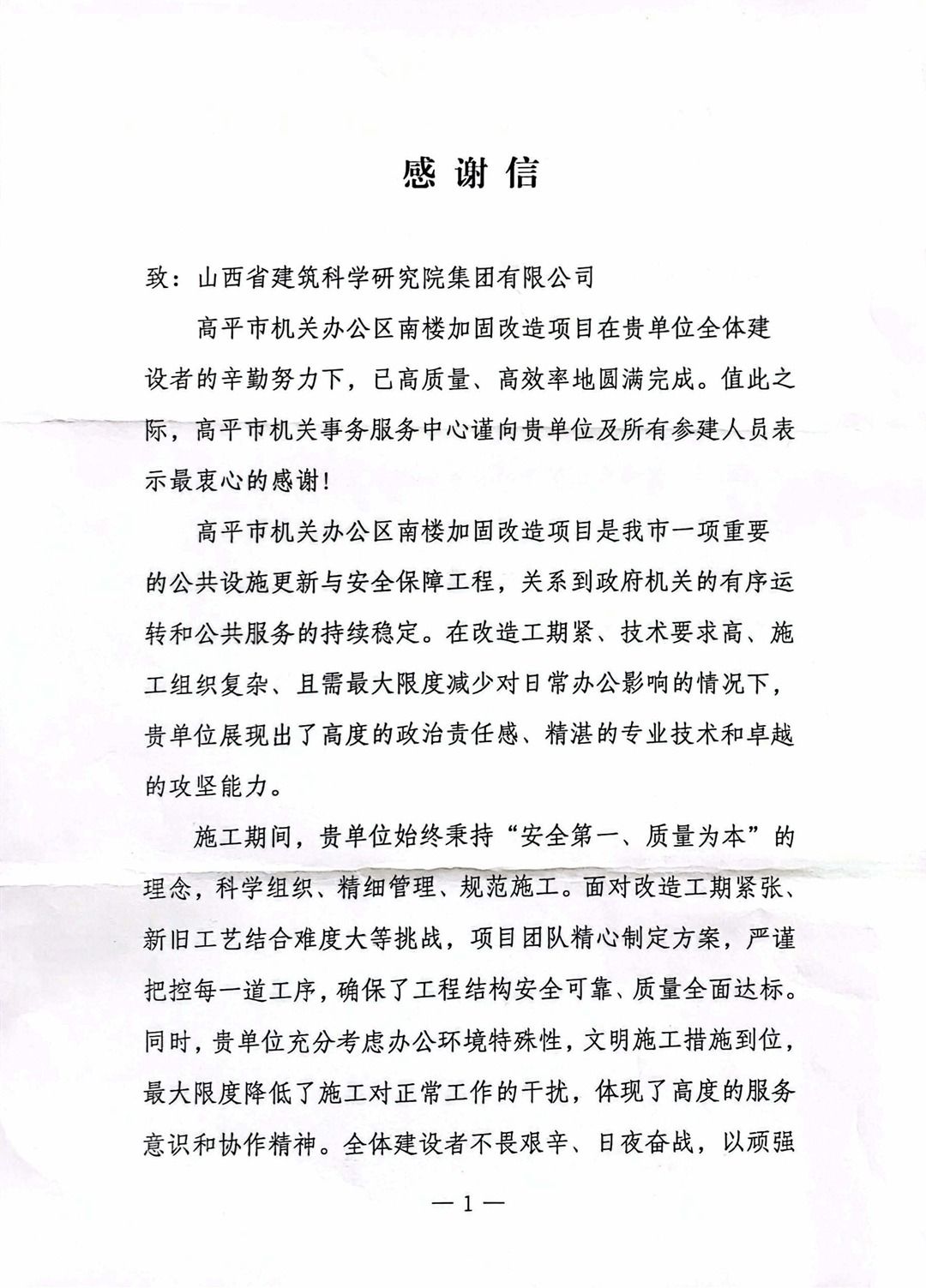近日,集团公司收到来自高平市机关事务服务中心的感谢信,信中对“高平市机关办公区南楼加固改造项目”圆满交付给予了高度肯定,对项目全体人员表示认可与赞誉,为该项目120天辛勤奋战画上了圆满句号。
