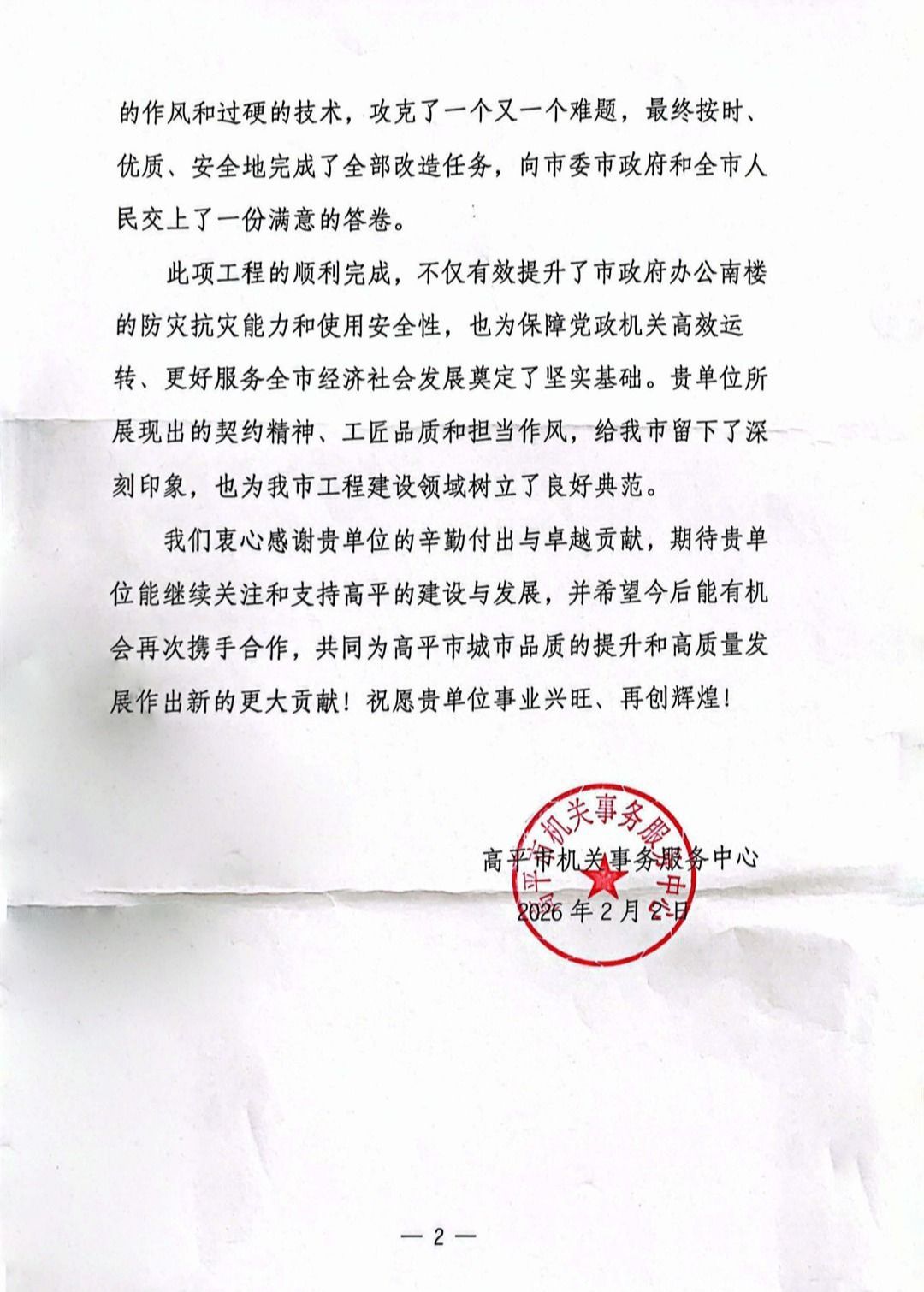 信中表示,高平市机关办公区南楼加固改造项目是高平市一项重要的公共设施更新与安全保障工程,关系到政府机关的有序运转和公共服务的持续稳定。在改造工期紧、技术要求高、施工组织复杂且需最大限度减少对日常办公影响的情况下,我公司展现出了高度的政治责任感、精湛的专业技术和卓越的攻坚能力。特别指出全体建设者不畏艰辛、日夜奋战,以顽强的作风和过硬的技术,攻克了一个又一个难题,最终按时、优质、安全地完成了全部改造任务,向市委、市政府和全市人民交上了一份满意的答卷。